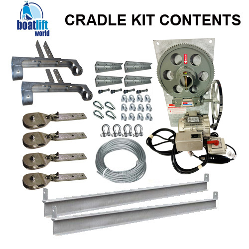 3000lb Capacity Max, Gear Unit 3/4 HP TENV (Totally Enclosed Motor), 110 Volt (220 Volt Optional) and In-line GFCI, Lock on Switch, 14' Electrical Wire Motor to Switch(1) Dual Pipe Bearing w/grease fitting (2) Pulley Hangers 3/8 in. thick x 2 1/2 in. x 12 in. Galvanized (4) 4 in. Pulleys *Galvanized Plates* 4 in. Aluminum Sheave w/Bronze 5/8 Bushing on 5/8 Shaft (4) 90 ft. Total 1/4 in. Galvanized Aircraft Cable (This will give 15' from upper pulleys down to all four corners to the cradles with a 10' wide boat slip) (Call us if additional amount of cable is needed) 1/4 in. Galvanized Drop Forged Cable Clamps (12) Galvanized Shackles (8) Chock Bracket w/Bolt (4) Bearing Bracket (4) 1/4" Thimbles (not shown in diagram) (4) Galvanized Cradle Beams - 4" x 9 ft Length (2) Cradle will fit a boat up to 8 ft. wide & boat slip needs to be close to 10 ft. wide to fit.